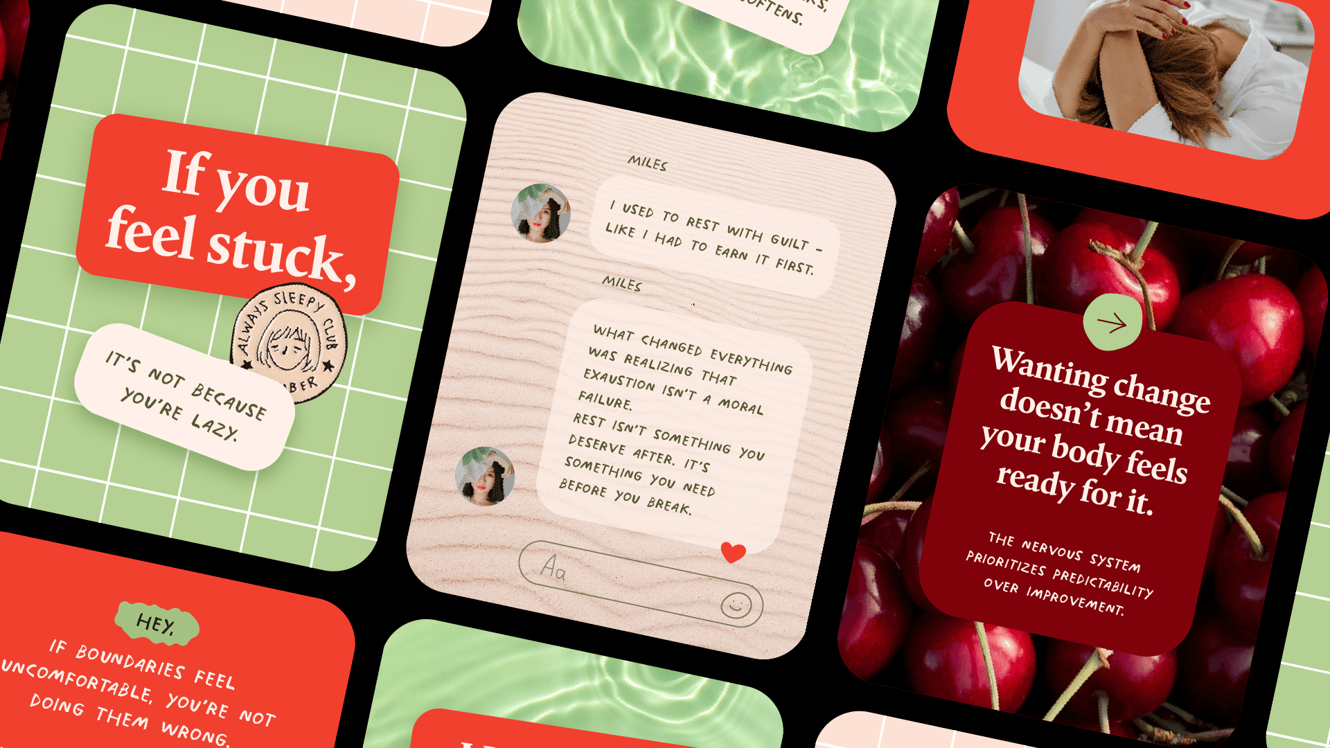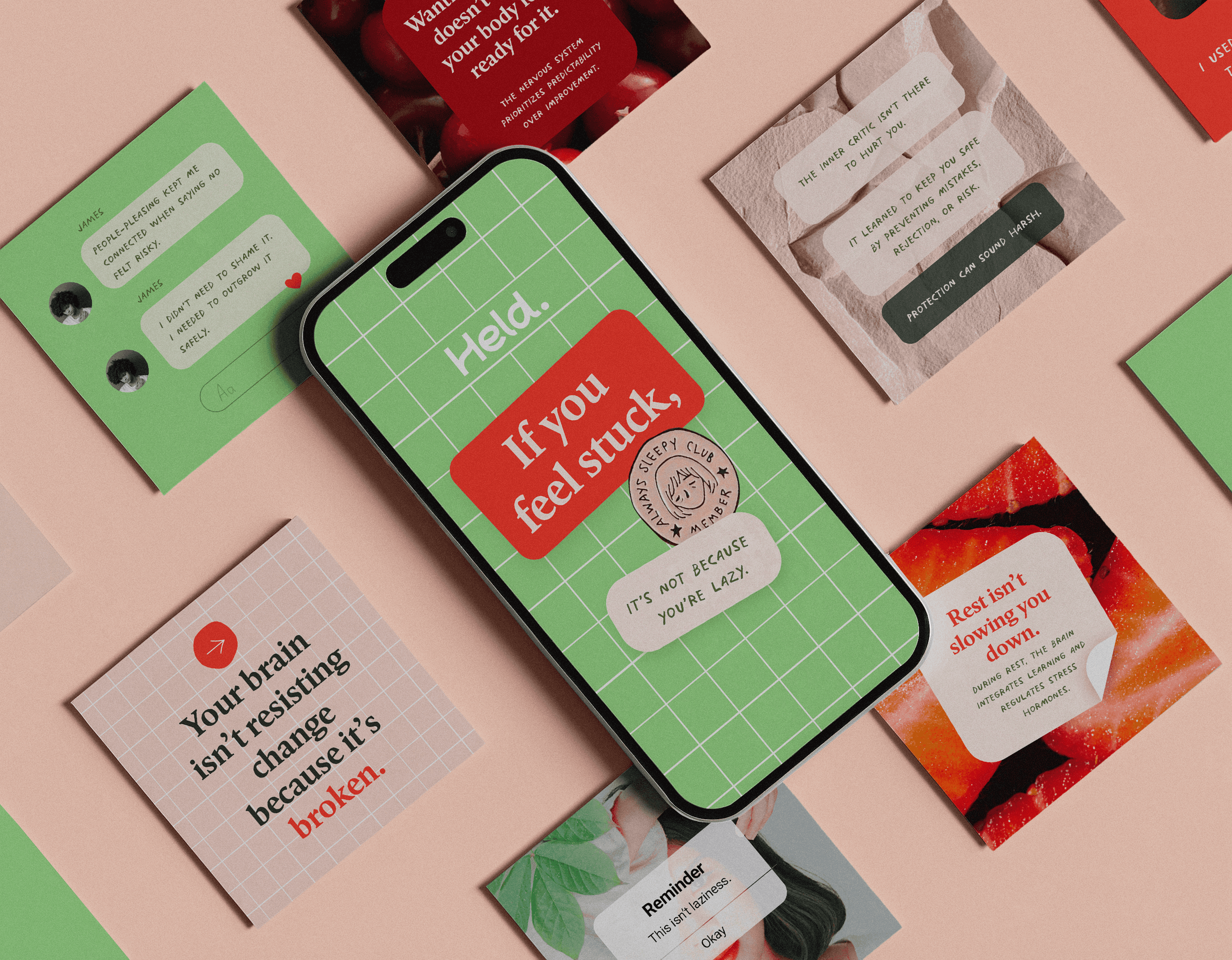 The biggest design challenge was balance — being warm without being naive, playful without losing credibility. Mindfulness and emotional wellness content can easily tip into the overly clinical or the overly sweet. With Held, the goal was to sit right in between — where cherry red adds a pulse of energy, handwritten fonts invite you in, and sage green keeps everything grounded and breathable.